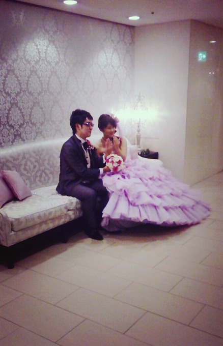 披露宴がお開きになった後に、お部屋のすぐ近くにあるソファで撮影しているところを